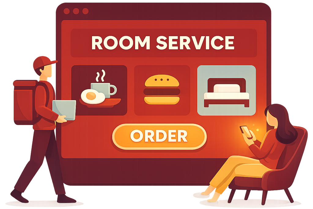 Ο επισκέπτης σκανάρει το ειδικό σταντ που βρίσκεται στο δωμάτιο, παραγγέλνει και πληρώνει αυτόνομα από το κινητό του.